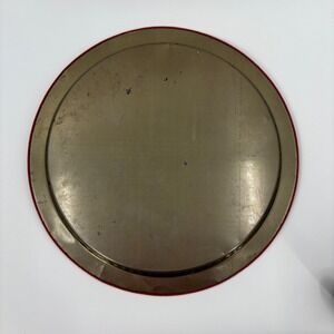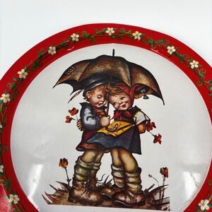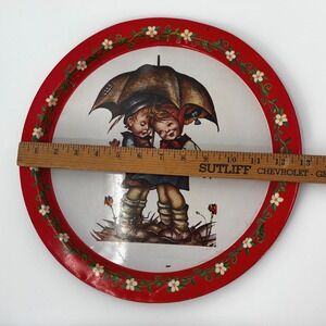 A vintage round metal serving tray featuring a charming illustration of two children sharing an umbrella in the rain, surrounded by scattered flowers. A decorative red border adorned with white blossoms and green leaves encircles the scene. This tray is perfect for serving drinks or snacks at a tea party or as a decorative piece on a shelf. Suitable for a whimsical kitchen display or a vintage-themed gathering. Please note that color of product in photo may vary slightly from actual color of product due to lighting and/or screen settings.