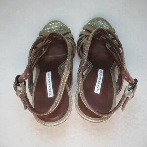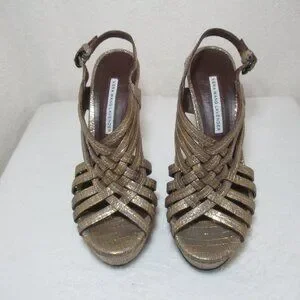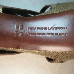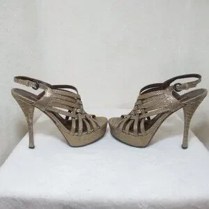 These stunning Vera Wang Lavender Label heels are pure evening glamour with a modern edge. Crafted in Italy from genuine leather, they feature a luminous metallic gold finish with a subtle reptile-embossed texture that catches the light beautifully. The woven strappy design hugs the foot elegantly, while the platform and slender heel create a flattering, confidence-boosting silhouette that feels timeless yet undeniably chic.