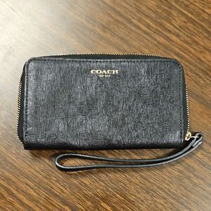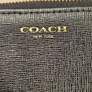 Classic black Coach wristlet in textured leather. Zip-around closure with gold-tone hardware and matching leather wrist strap. Inside has card slots and a divided compartment—perfect for on-the-go essentials. Zipper works smoothly.