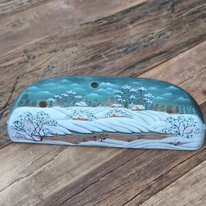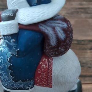 Charming Santa figurine riding a polar bear. Features intricate blue and red details.