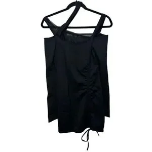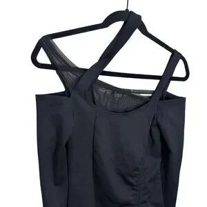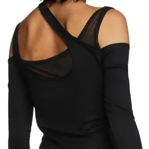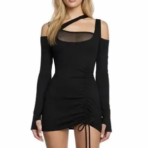Turn heads in this curve-hugging mini dress made from soft, stretchy jersey. Featuring an asymmetrical neckline, mesh bust panel, bold shoulder cutouts, long sleeves with thumb holes, and a ruched silhouette that accentuates your shape.