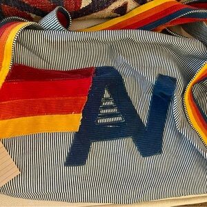 Stylish travel duffel by Aviator Nation. Long sold out/limited item. Duck canvas with blue pinstripe with corduroy detail in classic AV color stripes.