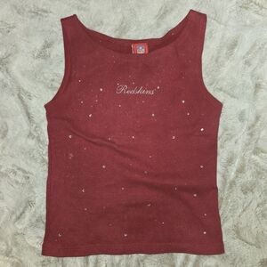 Features Redskins in script with rhinestone/rhinestud "starry" detailing on front and back in trendy ribbed style burgundy tank.