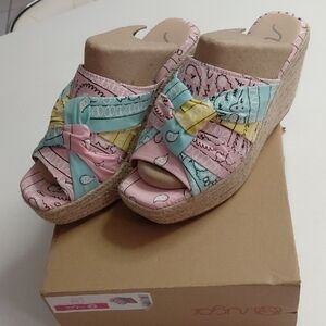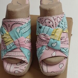 Chic wedges with pastel pink, blue, and yellow straps. Perfect for a stylish look. Just too high for me . Luv them fun,comfy and great if ur short!!!