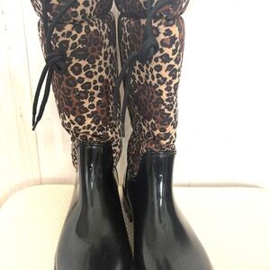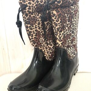 Corkys chic rain boots with leopard print and glossy black finish. Ideal for stylish for wet and cold weather. Size 8
