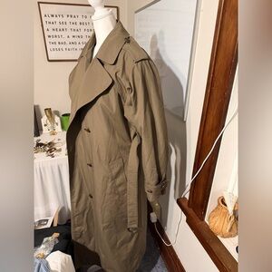 Vintage tan trench coat. Double-breasted design. Belted waist. Timeless style. Inner lining zips out to be cleaned. Extremely good condition. Could fit up to 1X