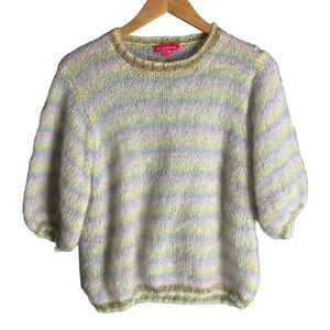 Rose Carmine Striped Mohair Blend Pullover Crew Neck Sweater in Pastel Pink Green Yellow Blue with Gold Mettalic Trim. Size 1 (S / M). Features crew neck, short puff sleeves, and open knit with gold metallic details at ribbed cuff, collar & hem. 70% Mohair, 25% Wool, 5% Polyamide. Excellent condition, no flaws.