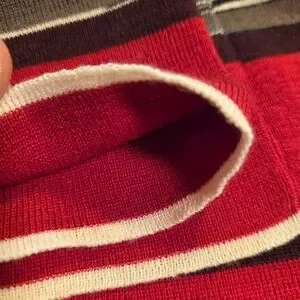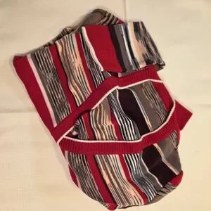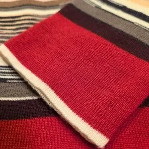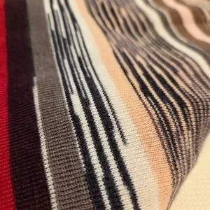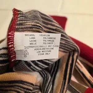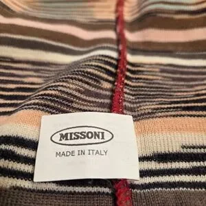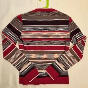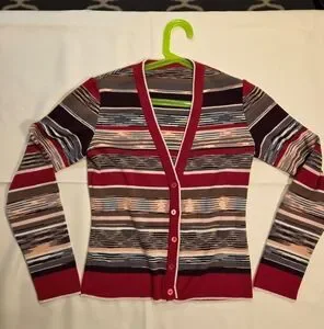 Vibrant striped cardigan by Missoni. Features a mix of red, brown, and cream tones. Button-up front with a V-neck design. Perfect for layering.
