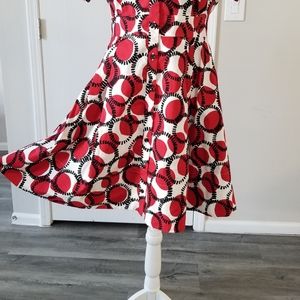 Chic short-sleeve dress with bold red and white pattern. Perfect for any occasion. Beautiful cut and print that is very hard to find!