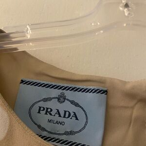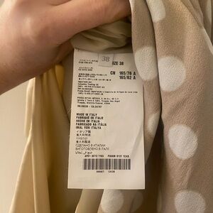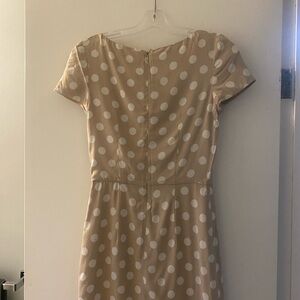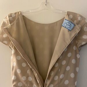 Elegant Prada midi dress with polka dot pattern. Features short capped sleeves and a flattering fit.