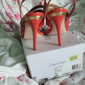 These Calvin Klein heels feature a striking coral and gold color palette, perfect for making a bold fashion statement. The elegant design includes multiple thin straps across the forefoot and a secure ankle strap, all complemented by a high heel for added sophistication. Ideal for special occasions, these heels combine modern style with a touch of glamour.