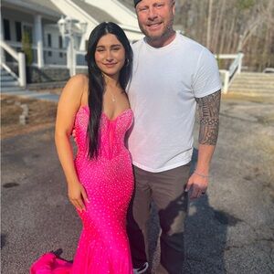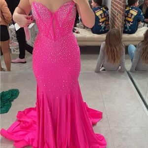 Hot pink prom dress worn only once and in excellent condition. This dress features a corset-style bodice, fitted silhouette, and a floor-length mermaid skirt with a small train. Fully embellished with sparkles that shine beautifully in person and in photos. Super flattering and comfortable.