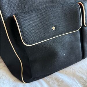 Elegant black canvas tote with cream piping. Features dual front pockets. Ideal for daily use.