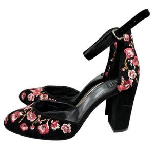 Absolutely gorgeous black Suede heels with red & pink floral embroidery and ankle strap. Chic block heel makes them easy + comfortable to walk in. Perfect for weddings, holiday parties, dinner dates, or dressing up denim.