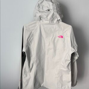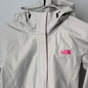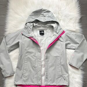 Experience warmth and style with this North Face 3 season waterproof jacket. Elegant gray with bold pink highlights. Ideal for variable outdoor adventures.