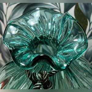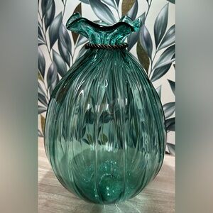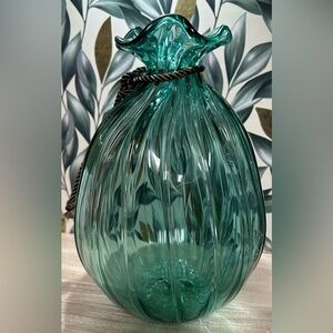 This is a beautiful Hand-Blown teal glass vase made by Pilgrim Glass West Virginia USA. This amazing pinched sack ruffled edge glass vase comes with the satin cord, a trademark of Pilgrim Glass.