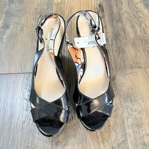 New High Wedge open toe ditsy sandals black patent wedge size 8