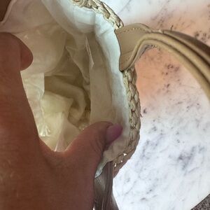 Toddler straw bucket tote bag with embroidered strawberries accents and faux-leather straps