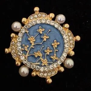 This is a vintage baroque-style alloy brooch pin with blue enamel flowers, crystal rhinestones, and imitation pearls.