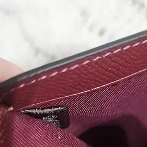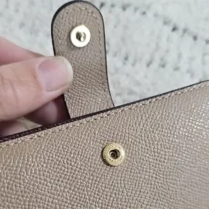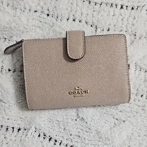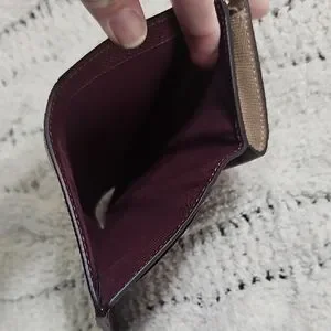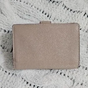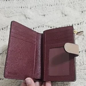 Stylish Coach wallet in beige leather with burgandy lining. Compact and chic design. Ideal for daily essentials.