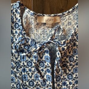 Beautiful LOFT floral blouse featuring a soft blue and ivory floral print with a flattering textured fabric. This piece has an easy, romantic silhouette with subtle puff sleeves and a feminine tie-neck detail that gives it a timeless yet on-trend feel.
