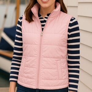 Classic and versatile, this Duck Head quilted puffer vest is perfect for layering in transitional seasons. Soft pink shell with quilted detail, full zip front, and pockets for practicality.