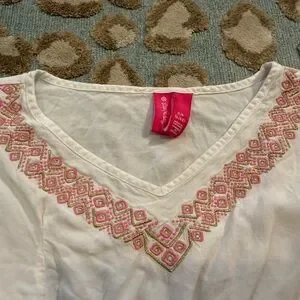 Chic white cover up with intricate pink embroidery. Ideal for relaxed outings. See stain in pic/video. Pre-loved condition.