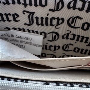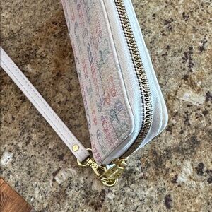 Juicy Couture white faux leather rainbow dots logo zipper wristlet wallet. Multiple slot and inner zipper pocket - see pic. Gold logo hardware on front. Detachable strap. New. No tags but has factory wallet card. Approximately 8 x 4 inches. Nonsmoking home.