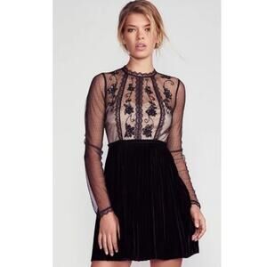 Free People Ariel Black embroidered Tulle long sleeve and Velvet pleated Mini Dress.