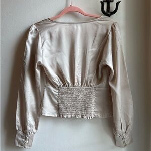 Chic satin blouse with a V-neckline. Features button-down front and long sleeves. Perfect for elegant occasions. Never worn! Tags removed.