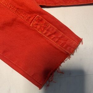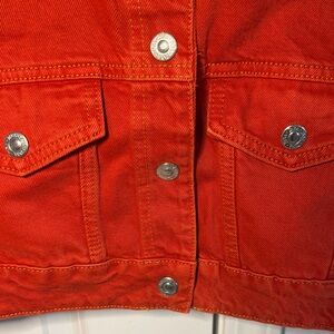 Elevate your style with this ZARA cropped denim jacket in a vibrant red orange hue. This jacket features a classic collared neckline, snap-front closure, and two chest pockets with button detailing. The long sleeves are unfinished with wide cuffs, adding a unique touch. The cropped silhouette makes it a stylish layering piece.