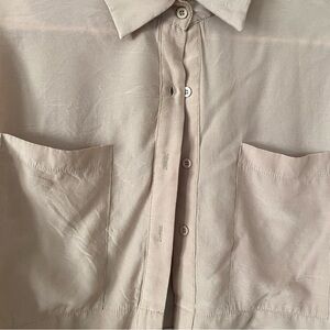 Chic tan shirt with button-down front. Features short sleeves and a relaxed fit. Ideal for casual or dressy occasions. Cropped fit