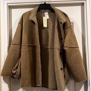 Cozy tan sherpa jacket from Banana Republic. Features a soft texture and button closure. Ideal for layering in cooler weather.