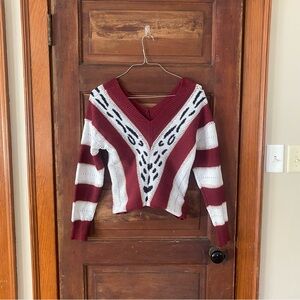 Elevate your style with this chic off-shoulder sweater. Featuring a bold red and white design, it's perfect for any occasion. Stay cozy and fashionable.