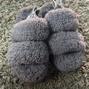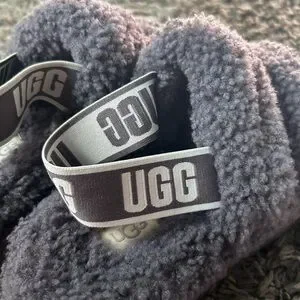 Cozy and stylish UGG sandals in a fluffy gray design. Perfect for casual wear. The tag from the inside was cut out so I’m not sure of the tag size, so I did measure. The photo is in the album. Looks like a 5/6 in my opinion.