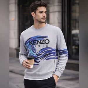 Authentic Kenzo Paris sweatshirt featuring the brand’s iconic wave graphic and embroidered logo across the front. Crafted from 100% cotton with a soft interior and high-quality construction.
