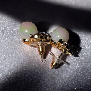 Cute fashion stud earrings with gold-tone finish, pink bow, and faux pearl detail 🎀✨