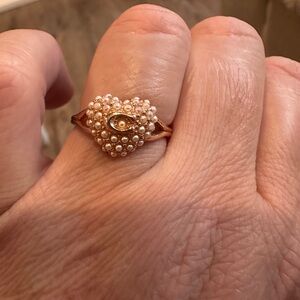 Charming heart-shaped ring by Coach. Rose gold and adorned with delicate pearls.