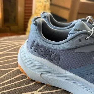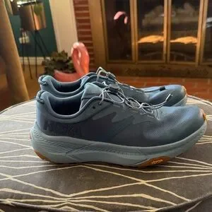 Sleek Hoka shoes in slate blue. Ideal for running and workouts. Barely worn, excellent condition. Bungee laces for easy on & off.