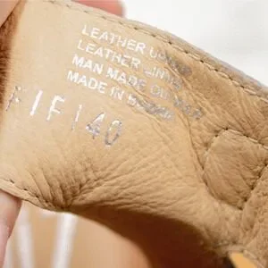 European leather upper, perforated front with moldable wiring, stud detailing, adjustable ankle strap with buckle closure. Leather lining, padded footbed, rubber outsole