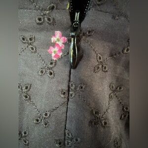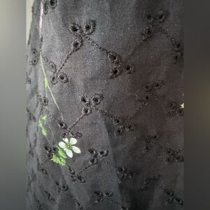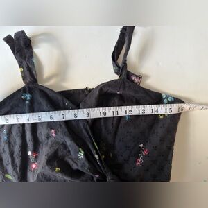 Chic black midi dress with colorful floral accents. Features a wrap design and adjustable straps.