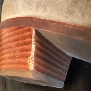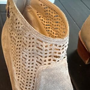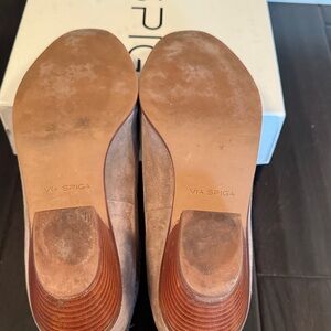 Step out in style with these comfy suede ankle boots from Via Spiga. Almond toe, zip and snap rear closure, gently worn, fabulous condition. The only visible flaw is on the inner left heel; see photo. Other than this these booties look great! Still smell like leather on the inside. Smoke and pet free home.