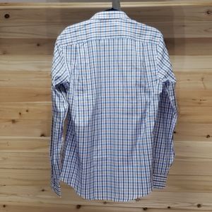 Spread collar - Removable stays - Tapered cuffs - French front - checkered/gingham print in subtle orange and blue on a white background- Curved shirttails - Stretch tailored slim fit -