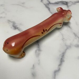 This unique and quirky vintage 1950s salt and pepper shaker set features a long pig design where salt dispenses from the head and pepper from the rear. Made by the Empress Company in Japan, this one-piece design is both functional and fun. The original corks are intact, adding to its charm and collectibility. With a 10" length, this piece will stand out in any collection and is sure to spark conversation.