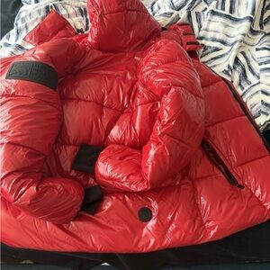 Stylish red puffer jacket with a hood. Perfect for cold weather. Bought for a ski trip that didn’t happen. Used only a few times during cold days