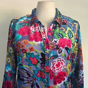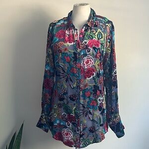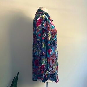 Vivid floral design with a mix of colors. Long sleeves and button-down style. Perfect for a bold look.