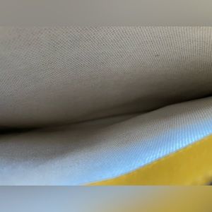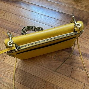Chic Gucci shoulder bag in bright yellow. Features a striking red and blue accent. Elegant gold chain strap. Ideal for any event.