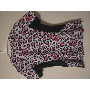 Womens scrub top featuring a vibrant leopard print pattern with pink accents.