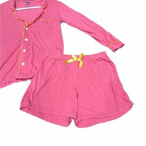 Kickee Pants pajamas, women’s bamboo sleepwear, pink pajama set, collared short sleeve top, pj shorts set, soft loungewear, size large pjs, comfy nightwear, breathable bamboo pjs, cozy women’s lounge set