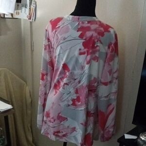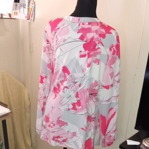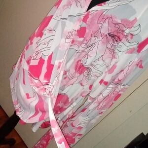 Elegant floral wrap blouse with vibrant pink and white design. Perfect for any occasion.